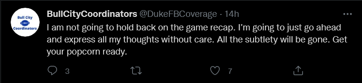 - A mobile quarterback who isn’t running the ball. Why did we stop running Gunnar after the Kansas game? I get that you don’t want him to get hurt, but the yardage is there. Let Gunnar run the ball a few times. He looked real comfortable against Kansas, and while we can’t afford an injury, playing scared is playing to lose. And, checks notes, that’s sure what the Blue Devils are doing right now. Why is the offensive strategy built around fear? Well, let’s take a look at number three …