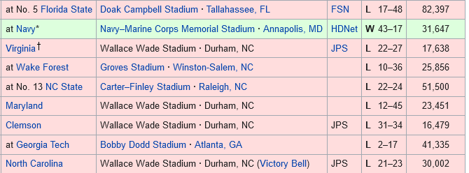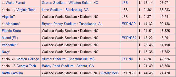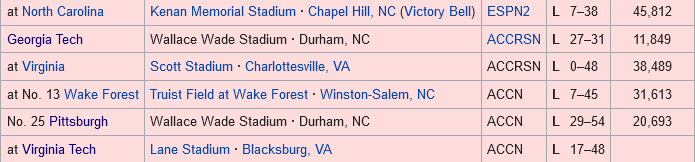 Why is Virginia Tech struggling important? Good question, because it isn’t like Duke is looking hot right now. Furthermore, this team hasn’t done anything since September that would cause us to expect a win. Well, here’s why Tech struggling is important. Most of the VT fanbase is looking ahead to the next season and is ready for a new coach. The rumor mill won’t stop turning about VT. Further, Burmeister may not start at QB for the Hokies and, if the players have thrown in the towel like a lot of the fans suspect, the Blue Devils can snatch a road win and avoid a winless conference season. (Can I just say the fact that we’re talking about this during a relatively healthy season is a sign of how low the program has sunk?) Also, some of my VT pals have pointed out that the quarterback situation behind Burmeister is a mess and that could help our guys from Durham. VT struggling is a good thing for the visiting team. So, with that in mind, let’s turn to the trends coming out of the Bull City.