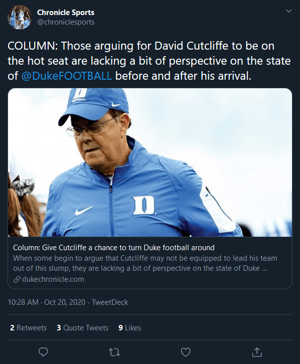What the Blue Devils returning their start of the century performance tells us is that Cutcliffe isn’t up for the job. And that’s okay. Like Marcus Aurelius noted, “Everything, a horse, a vine, is created for some duty.” Cutcliffe’s duty was to rehabilitate Duke football. He’s done his duty. It’s time for someone else to take the ball from here.