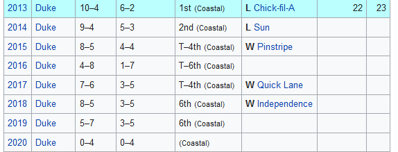 The final thing I want to say is that the last two seasons, starting at last year’s UNC debacle, has seen Duke come full circle under Cutcliffe and land back in Carl Franks and Ted Roof territory. These teams are just as bad as those teams were. And while Franks and Roof had excuses (poor assistant pay, lack of facilities, no commitment from the school), Cutcliffe has zero. None. His teams are more talented, the assistants are paid well and the facilities are outstanding. The stadium was renovated. There are no excuses.